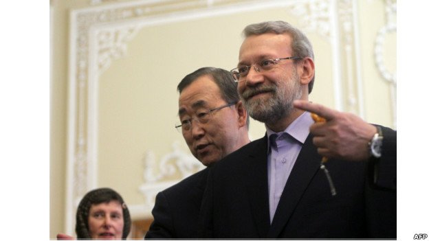دیدار بان کی مون با رئیس مجلس ایران. او روز اول حضور در ایران، ناهار مهمان علی لاریجانی بود.
