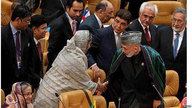 دیدار حامد کرزی، رئیس جمهور افغانستان با هیات بنگلادش. نخست وزیر بنگلادش در گوشه سمت چپ تصویر دیده می شود.