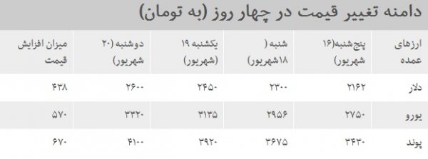 این در حالی است قیمت دولتی این ارزها کمتر از نصف این رقم است و هر دلار آمریکا ۱۲۲۶ تومان، هر پوند۱۹۶۰ و هر یورو ۱۵۶۷ تومان است.