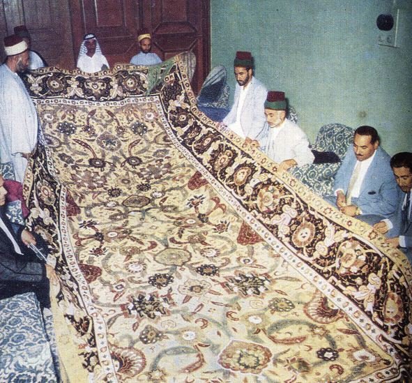 این عکس مربوط به فرش ضخیم به طول 7 متر و عرض 3 متر است که شاه عباس صفوی قدرتمندترین پادشاه سلسله صفویه به حرم امام علی هدیه داده بود. گفته شده در سال 1950 کارشناسی از ایران ضمن دیدار از این فرش، ارزش آن را نیم میلیون دینار عراق اعلام کرد. این فرش از ابریشم و طلا بافته شده است.