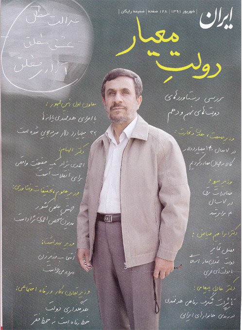 در ویژه نامه "دولت معیار" که توسط روزنامه دولتی ایران منتشر شد سه شعار عدالت مطلق،عشق مطلق و آزادی مطلق به عنوان شعار دولت احمدی نژاد انتخاب شده است.