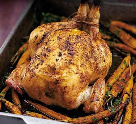 5 - ظرف را 30 دقیقه داخل فر قرار دهید تا مرغ سرخ شود و رنگ آن طلایی گردد. سپس آن را از فر بیرون بیاورید. مرغ را به ظرف دیگری منتقل نمایید و هویجها را به هم بزنید تا همهی آنها به مواد داخل ظرف آغشته شوند. مرغ را دوباره به ظرف حاوی هویج و سایر مواد بازگردانید. آن را به محتویات داخل ظرف آغشته نمایید و دوباره به مدت 40 الی 50 دقیقه داخل فر بازگردانید تا مرغ کاملاً پخته شود.