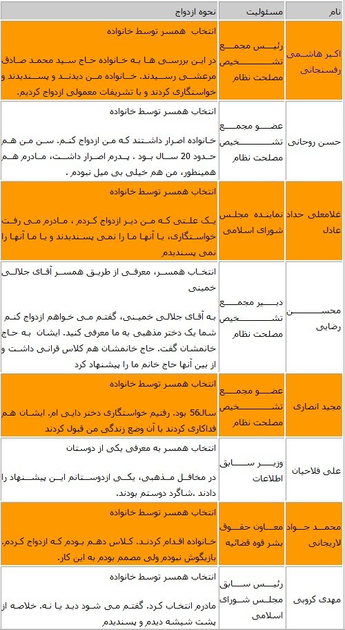 نحوه آشنایی و ازدواج چهرههای سیاسی کشور دارای جذابیتهای فراوانی است.اکثر سیاسیون ایرانی همسرانشان رااز طریق خانواده به ویژه مادر خود انتخاب کردهاند.
