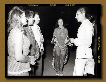 هشتمین جشنِ هنرِ شیراز. فرحِ پهلوی در حالِ گفتگوی با هنرمندان. از چپ به راستِ تصویر: مهین شهابی، عزتالله انتظامی، علی نصیریان و فرزانه تأییدی.
