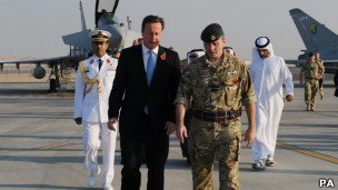 گفته شده دیوید کامرون از این سفر برای عرصه تجهیزات دفاعی بریتانیا به کشورهای حوزه خلیج فارس استفاده می کند