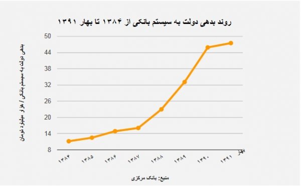 براساس آمار بانک مرکزی، میزان بدهی دولت به سیستم بانکی در خرداد ماه امسال به ۴۷٫۵ هزار میلیارد تومان رسیده، در حالی که این رقم در پایان سال ۸۴، ۱۱٫۲ هزار میلیارد تومان بوده است.