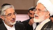 میرحسین موسوی (راست) در کنار آیتالله سید علی محمد دستغیب