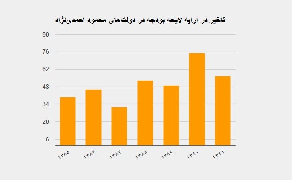 در این سالها، رکورد تاخیر در ارایه لایحه بودجه، مربوط به لایحه بودجه سال ۹۰ بوده که در اول اسفندماه سال ۸۹، با ۷۵ روز تاخیر به مجلس ارایه شد.