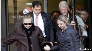 ساعاتی پیش خانم کلینتون، دخترش چلسی و همسرش بیل کلینتون از بیمارستان خارج شدند.