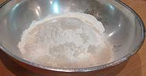مرحله 1 - آرد زا الک کرده، مایه خمیر، بهبود دهنده، نمک و شکر را اضافه کرده و مواد را با هم مخلوط کنید.
