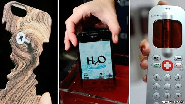گوشیهای موبایل و ضمائم آن ها نیز از دیگر محصولات با اهمیت در این نمایشگاه هستند. تصویر چپ متعلق به قاب آیفون Sculpteo 3DPCase است که به شکل دو صورت که به یکدیگر خیره شده اند، ساخته شده است. تصویر وسط نمایشی از تکنولوژی گوشی‌های ضدآب است و تصویر راست، گوشی Spare One است که با دو عدد باتری قلمی (AA) کار می کند و قیمت آن 99 دلار است.