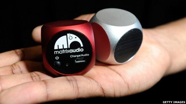 در این تصویر دو عدد اسپیکر ساخت شرکت Matrix Audio دیده می شود. گفته شده که این دو، کوچکترین اسپیکرهای 3 وات در جهان هستند (کمی کوچیکتر از یک توپ گلف). قیمت هرکدم از آنها 50 دلار است و می توان آنها را به صورت آنلاین سفارش داد.