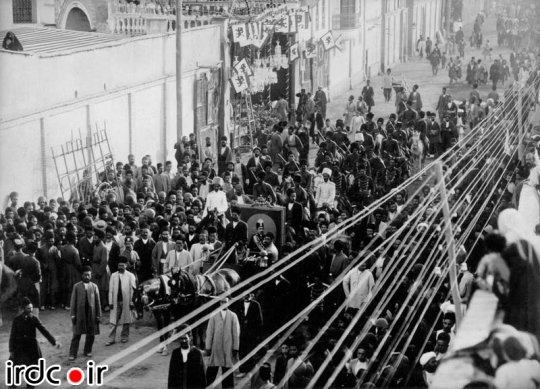 عبور کالسکه حامل عکس محمدعلی شاه قاجار از خیابانهای تهران جهت انتقال به مجلس شورای ملی