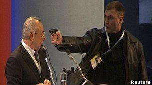 فرد مهاجم در حین سخنرانی آقای دوگان به روی جایگاه رفت و اسلحه کمری خود را به سوی سر او نشانه گرفت.
