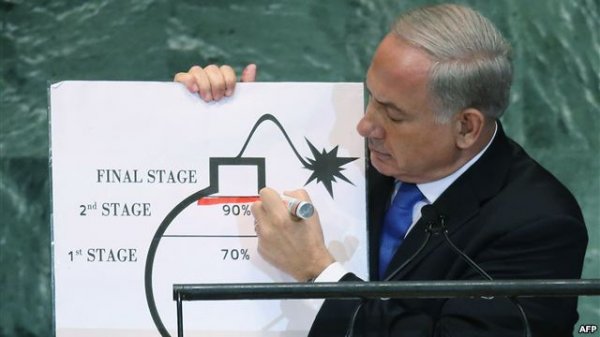 بنیامین نتانیاهو چهار ماه پیش در مجمع عمومی سازمان ملل تصویری به دست گرفت و با کشیدن خط قرمز بر روی یک بمب گفت که ایران نباید به توانایی غنی‌سازی اورانیوم در حد بالا دست یابد و اگر اورانیوم غنی‌شده با غلظت بیست درصد به حد کافی انبار کند، می‌تواند بمب هسته‌ای بسازد.