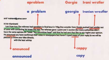 ماجرا از این قرار است که نامه فدراسیون به مارتینتی، از سوی دبیر فدراسیون کشتی و با ایمیل شخصی او ارسال شد. در این نامه که مجموعاً 4 خط است، علاوه بر چندین و چند غلط املایی، انبوهی از اشتباهات و خطاهای نگارشی وجود دارد که اساساً نامه مذکور را از شکل نامههای اداری و رسمی خارج کرده است. همانطور که در تصویر فوق میبینید در این نامه کلمات بسیار پیشپا افتاده انگلیسی همچون واژه copy به اشتباه coppy نوشته شده و بدتر آنکه نام کشور گرجستان Georgia به اشتباه Gorgia درج شده و همین باعث شده تا مارتینتی در نامه خود صراحتاً بگوید: «یاد آور میشوم که من نمیدانم ملیت کشتیگیر مورد اشاره شما چیست؟»