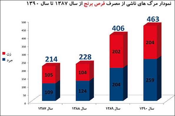 بر اساس آمار سازمان پزشکی قانونی کشور طی 9 ماه اول امسال 449 نفر که 245 نفر آنها مرد و 204 نفر زن بوده اند به علت استفاده از قرص برنج جان خود را از دست داده اند. این در حالی است که در 9 ماه سال 1390 ، 354 نفر جان باخته بودند (198 نفر مرد و 156 نفر زن) و مقایسه آمار 9 ماهه سال 1390 با سال جاری نشان می دهد آمار مرگ های ناشی از مسمومیت با قرص برنج 26.8 درصد افزایش داشته است.