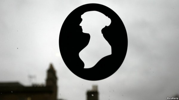 نیمرخی از جین آستن روی شیشه پنجره مرکز جین آستن در شهر باث بریتانیا.