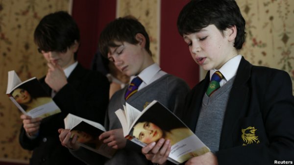 در این عکس، سم وایلد (چپ)، هنری توماس (وسط) و پاتریک اکبر (راست)، سه نفر از دانش‌آموزان مدرسه بیچن‌کلیف در مراسم خواندن کتاب غرور و تعصب در شهر باث دیده می‌شوند.