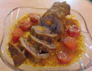 * زرشک و یک ساقه کرفس به همراه هویج بر روی گوشت گذاشته و آن را لوله کرده و در آخر دور تا دور آن را با نخ میپیچیم.