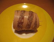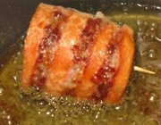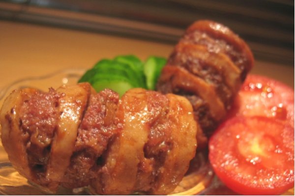گوشتهای ورز داده شده را لای هر تکه سوسیس می پیچیم.