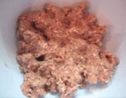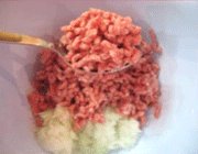 یک عدد پیاز متوسط را رنده کرده، با یک کاسه ماست خوری گوشت چرخ کرده و کمی نمک و فلفل ورز می دهیم.