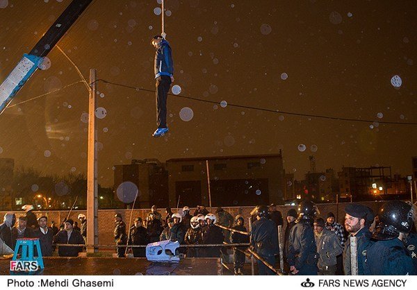 متهم به بالای جرثقیل هدایت شد و طناب سفیدرنگ به دور گردن وی انداخته شد.