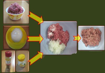 پیاز را با دنده ریز رنده میکنیم و گوشت چرخ کرده و نمک و فلفل را اضافه میکنیم سپس آن را ورز میدهیم.