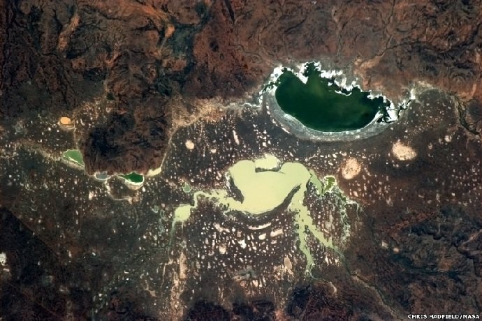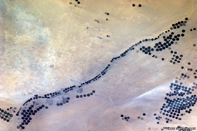 هادیفیلد می گوید که هدفش از به اشتراک گذاشتن این عکس ها این است که مخاطبانش به طور مستقیم ببینند که زندگی بر یک وسیله نقلیه پژوهشی که به دور زمین می گردد، چگونه است؟ عکس: مزارعی با سیستم آبیاری چرخشی