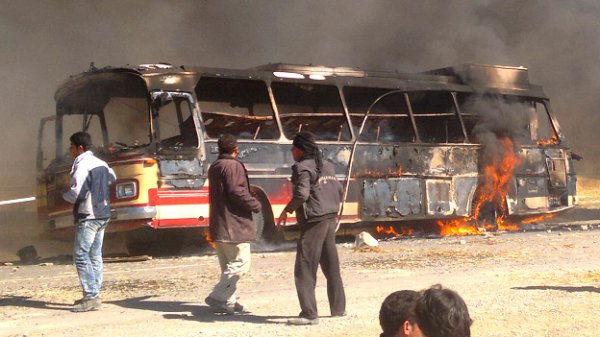 کشاورزان معترض، چند اتوبوس حامل نیروهای دولتی را به آتش کشیدند. عکس دریافتی از یکی مخاطبان بی بی سی