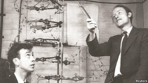 فرانسیس کریک (چپ) و جیمز واتسون با مدل اولیه مولکول دیانای تقریبا در همان زمانی که این کشف را به دنیا اعلام کردند