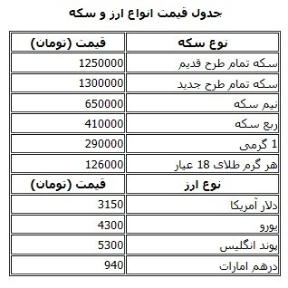 همچنین در پی سقوط قیمت ارز در بازار، قیمت انواع سکه نیز با کاهش مواجه شده است. هم اکنون قیمت هر قطعه سکه تمام طرح قدیم یکشنبه 1 میلیون و 250 هزارتومان، هر قطعه سکه تمام طرح جدید 1 میلیون و 300 هزارتومان، نیم سکه 650 هزارتومان، ربع سکه 410 هزارتومان و سکه گرمی 290 هزار تومان است.