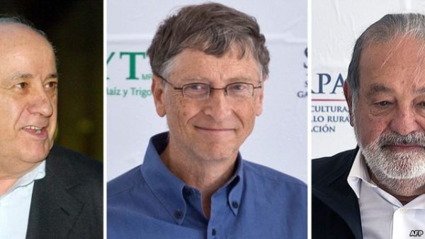 سه ثروتمند نخست جهان در سال ۲۰۱۳؛ از راست: کارلوس اسلیم، بیل گیتس و آمانسیو اورتگا صاحب اسپانیایی شرکت تولید پوشاک «زارا».