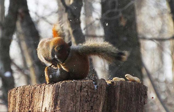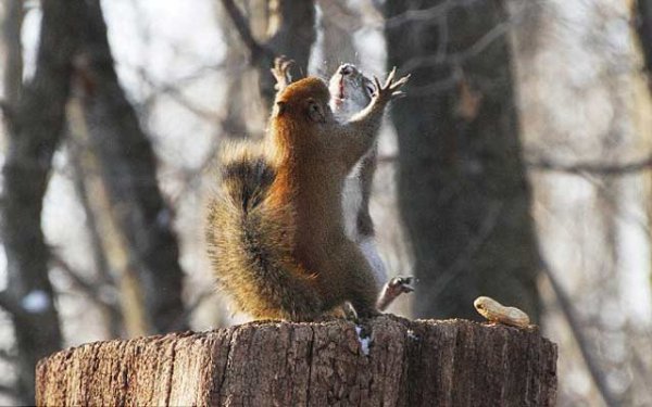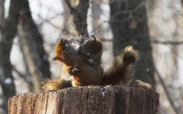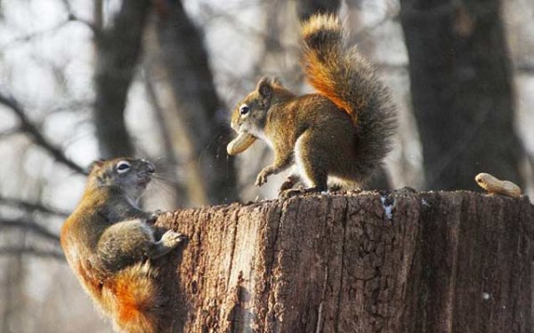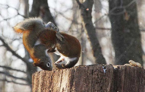 تصاویر زیر نشان می دهد نزاع بین دو سنجاب در بالای تنه درخت با توجه به جشن شام لوکس که یک دانه بادام زمینی است، رخ داده است. سنجاب ها معمولا با ترساندن و یا تعقیب یکدیگر، از و وعده های غذایی خود محافظت می کنند؛ اما در این تصاویر خشونت به نهایت خود رسیده است.