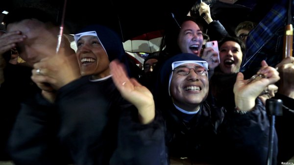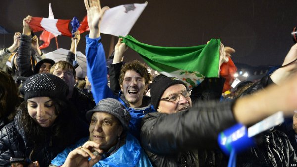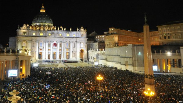 ده ها هزار نفری که در میدان سن پیتر در انتظار انتخاب پاپ بودند با دیدن دود سفید فریاد شادی سر دادند
