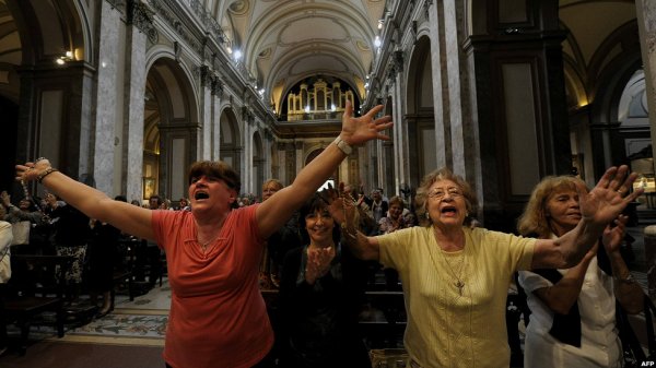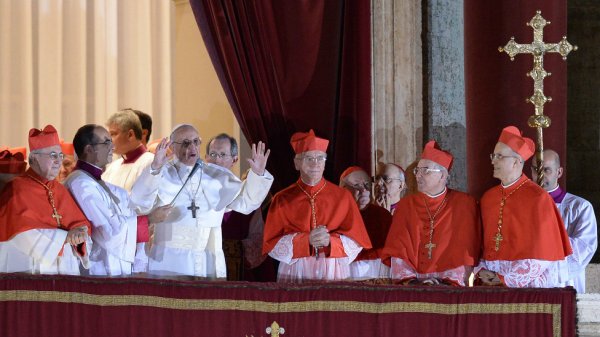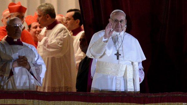 کاردینال خورخه ماریو برگولیو، پاپ جدید، ساعتی بعد معرفی شد و بر بالکن کلیسای سن پیتر حضور یافت