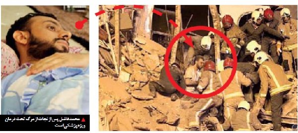 نیم ساعت بعد با کمک آتشنشانان همسرم مرضیه و دخترم و پسرم که بشدت مجروح شده بودند از زیر آوار بیرون کشیده شدند و توسط ماموران اورژانس به بیمارستانهای بعثت و سینا انتقال یافتند. متاسفانه یک پسر و دختر دیگرم در زیر آوار تسلیم سرنوشت مرگ شدند.