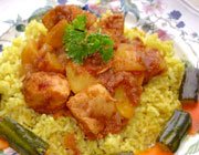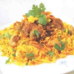 * داخل قابلمه، پیاز را در روغن نباتی تفت دهید تا سرخ و طلایی رنگ شود. زعفران، هل، چوب دارچین، زنجبیل و برنج را اضافه نمایید. مواد را به هم بزنید تا برنج کاملاً به همه مواد آغشته شود.