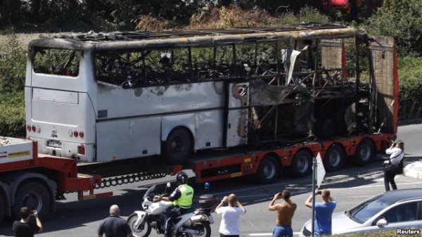 صحنه‌ای از اتوبوس منفجر شده حامل گردشگران اسرائیلی در بورگاس بلغارستان.