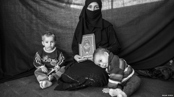 در این عکس زنی ۲۵ ساله به نام ایمان در اردوگاه نزیب ترکیه دیده می شود. هنگامی که او از شهر حلب فرار کرد، تنها توانست پسرش احمد و دخترش عایشه را با خود بیاورد... و قرآنی که می گوید از او حفاظت خواهد کرد.
