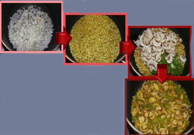 یک عدد پیاز را در نصف فنجان روغن سرخ کرده، کمی زردچوبه به آن اضافه میکنیم. سپس قارچ و فلفل دلمه ای خرد کرده، کمی نمک و فلفل به آن اضافه کرده، تفت میدهیم.
