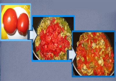 دو الی سه عدد گوجه فرنگی خرد شده را اضافه کرده، با شعله زیاد تفت میدهیم.