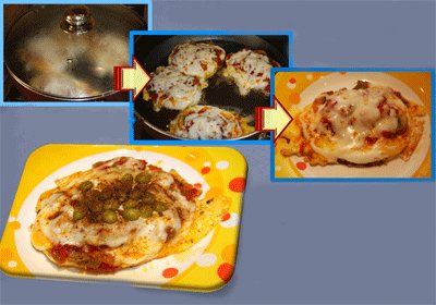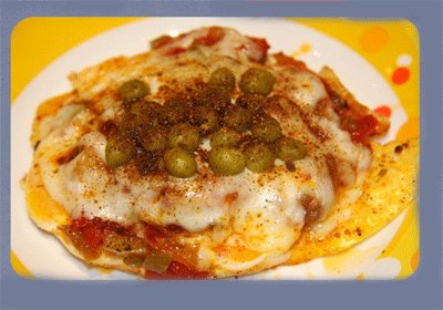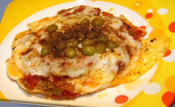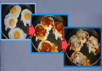 در ماهیتابه را گذاشته تا پنیر پیتزا ذوب شود سپس شعله را خاموش کرده، آن را در بشقاب میکشیم. میتوان چند عدد کنسرو نخود فرنگی، کمی سماق و آویشن نیز روی آن ریخت. چهار تخم مرغ دیگر را نیز به ترتیب ذکر شده آماده میکنیم.