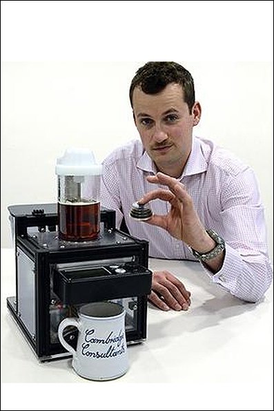 شرکت مشاوران کمبریج مبتکر این چای ساز معتقد است دستگاه آنها می تواند با استفاده از غلاف یا کپسول هایی که با برگ های چای پرشده اند و با سرعت بسیار بالایی می چرخند، چای را به مرحله بعدی ببرد.