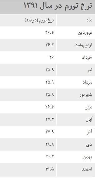 مرکز آمار ایران نرخ تورم تا پایان اسفندماه سال ۱۳۹۱ را ۳۱.۵ درصد اعلام کرده است. این میزان تورم بعد از دولت اکبر هاشمی رفسنجانی سابقه نداشته است.