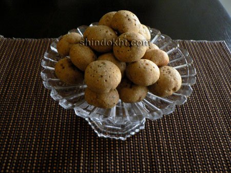 وقتی خمیر آماده شد از خمیر گلولههای کوچکی بر میداریم و داخل آن را با خرمای آماده شده پر میکنیم و در سینی فر