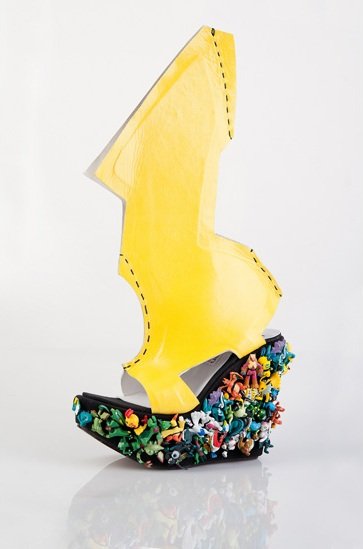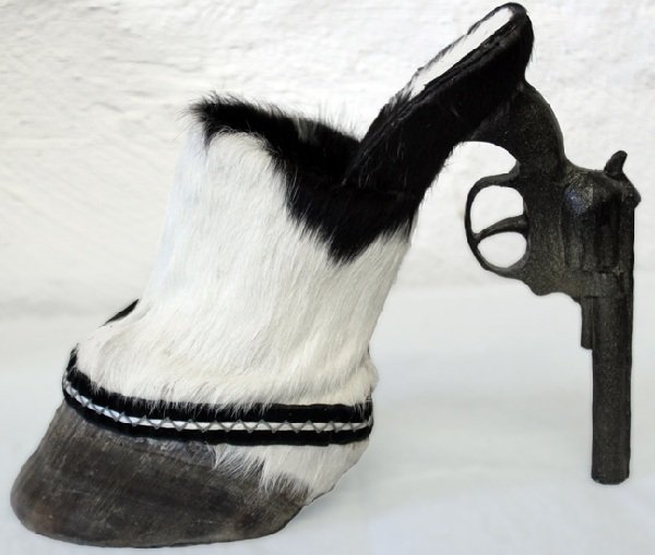 این نمایشگاه بر این ایده تاکید می کند که کفش می تواند در عین حال که بر اساس مد روز طراحی شده باشد، هنرمندانه و دارای هویت مستقل هم باشد. عکس: طرح گاوی توسط ایریس شیفرشیتاین، عکس: ویرچوال شو