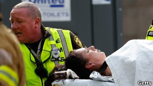 در پی وقوع انفجار، دوندگان زخمی را به چادرهایی منتقل کردند که برای کمک های اولیه پزشکی به شرکت کنندگان در ماراتن در نظر گرفته بودند.