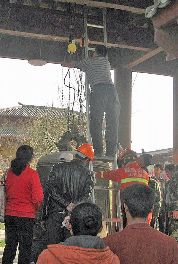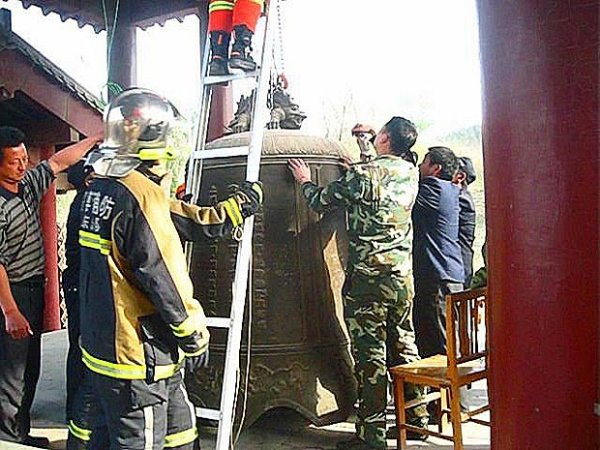در نهایت آتش نشانان با استفاده از جرثقیل این ناقوس را از روی آقای وانگ بلند کردند.