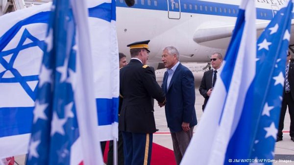 در آستانه ورود هیگل به تلآویو خبرنگاران از وی درباره معامله تسلیحاتی آمریکا با اسرائیل سؤال کردند. خبرنگاری پرسید که آیا معامله تسلیحاتی میلیاردی با اسرائیل این پیام را در بردارد که حمله نظامی هنوز یک گزینه است. هیگل گفت: «فکر نمیکنم جای هیچ سؤالی باقی باشد که این پیام روشن دیگری برای ایران است.»